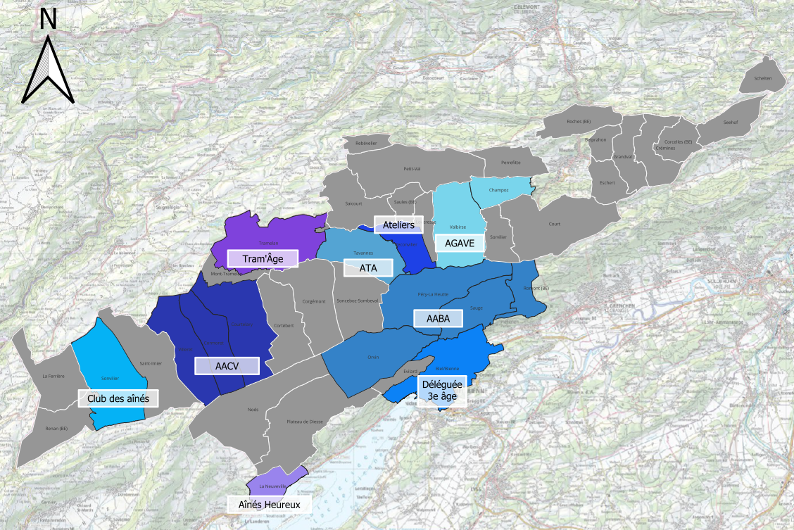 Le Réseau des aînés est constitué de représentants des associations d'ainés de la région. Voici un aperçu cartographique des association existantes et en constitution :